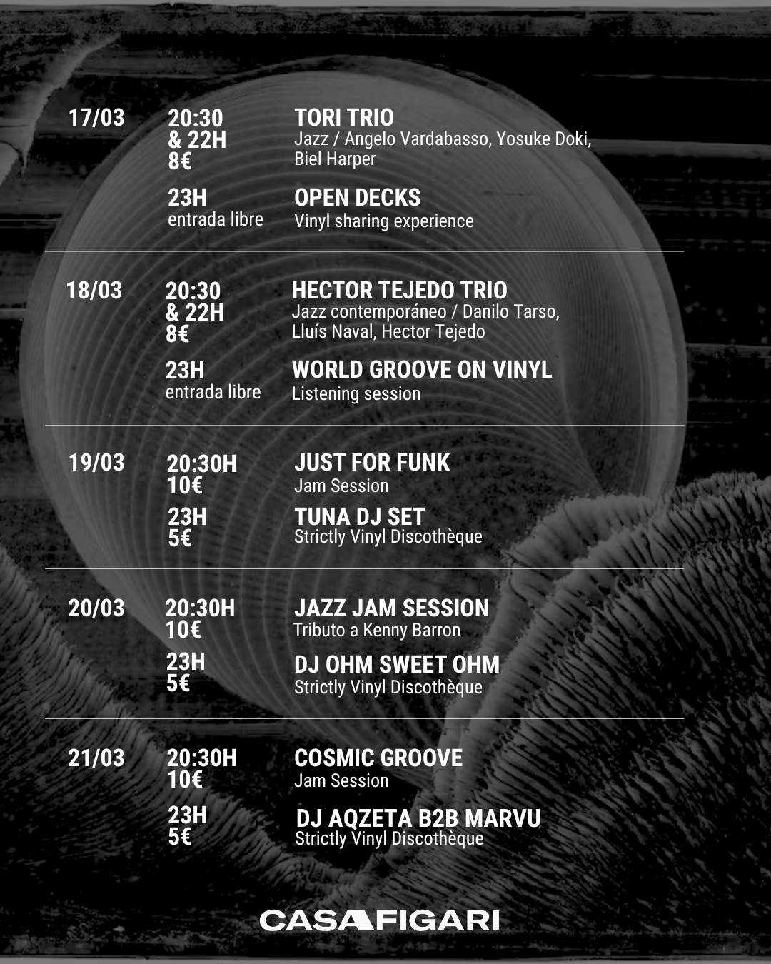 Apostamos por una programación musical potente y cuidadosamente curada, con actuaciones en directo de miércoles a sábado y DJ selectors los fines de semana. Casa Figari es un espacio donde podrás escuchar tanto a los músicos más influyentes de la escena del jazz local e internacional como a los nuevos talentos emergentes.